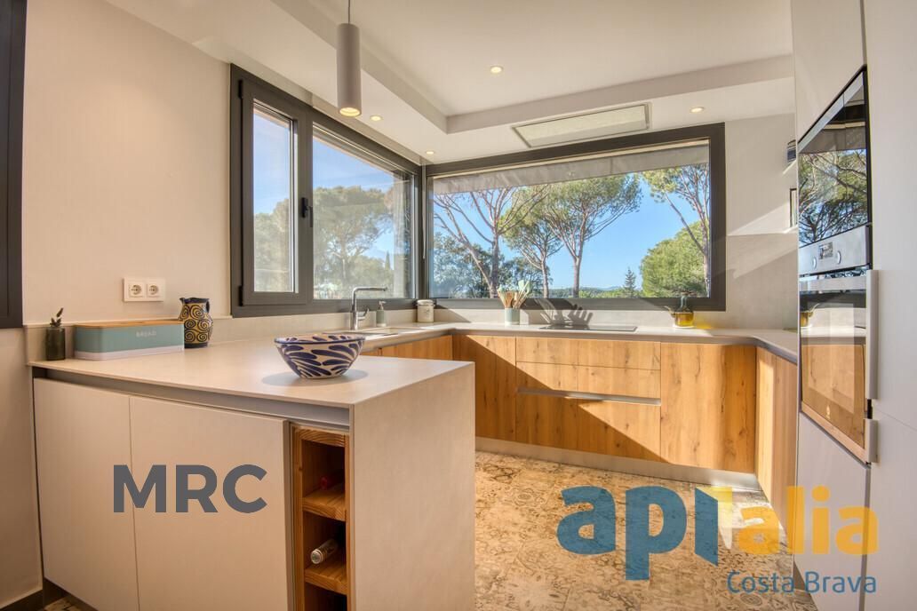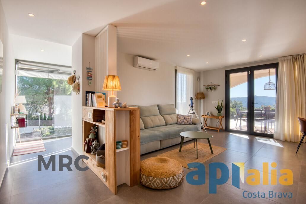 El luminoso salón con chimenea tipo insert se integra con una moderna cocina americana, creando un espacio funcional y acogedor. La terraza principal ofrece magníficas vistas al mar y a la montaña.