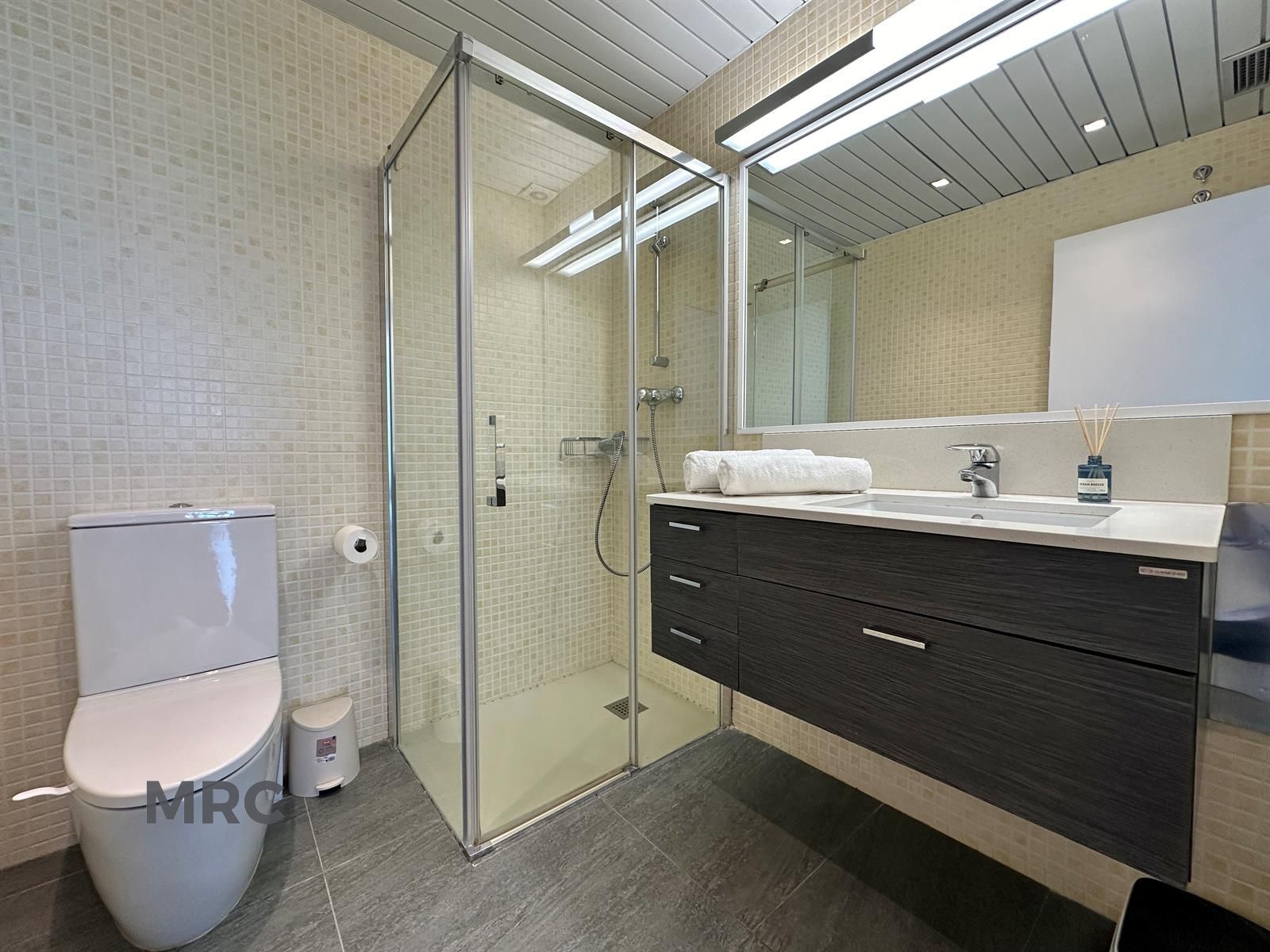 La cocina es amplia, moderna y completamente equipada con horno, microondas, lavavajillas, cafetera, tostadora, hervidor de agua, lavadora y secadora. Desde la cocina se accede directamente al salón-comedor, de estilo minimalista, que dispone de Smart TV, conexión WiFi y sistema de aire acondicionado y calefacción en todas las estancias.